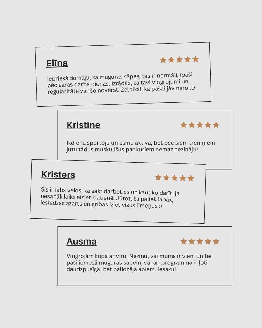 Svarīgi: Katrs vingrojums ir video formātā ar maniem detalizētiem skaidrojumiem – Tev būs sajūta, ka esmu Tev blakus un uzraugu katru kustību.